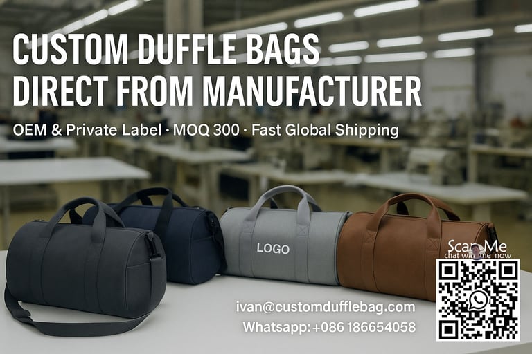 Custom duffle bags for gym and travel.CustomDuffleBag.com is a professional manufacturer specializing in premium custom duffle bags, gym bags, travel bags, and suit duffels. We offer factory-direct customization with low MOQs, fast production, and global shipping. Whether you need personalized bags for your brand, sports club, fitness studio, or corporate event, we deliver high-quality, made-to-order bags tailored to your specifications. Trusted by clients worldwide, we provide OEM & ODM services with expert craftsmanship and reliable service.