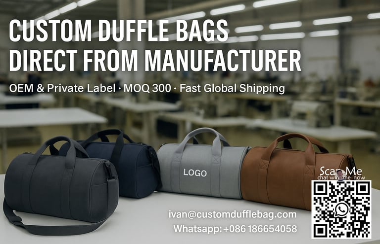 Custom duffle bags for gym and travel.CustomDuffleBag.com is a professional manufacturer specializing in premium custom duffle bags, gym bags, travel bags, and suit duffels. We offer factory-direct customization with low MOQs, fast production, and global shipping. Whether you need personalized bags for your brand, sports club, fitness studio, or corporate event, we deliver high-quality, made-to-order bags tailored to your specifications. Trusted by clients worldwide, we provide OEM & ODM services with expert craftsmanship and reliable service.